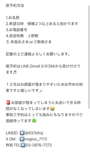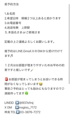 姫予約ご希望の方はLINE、Gmail、XのDMからご連絡ください♡