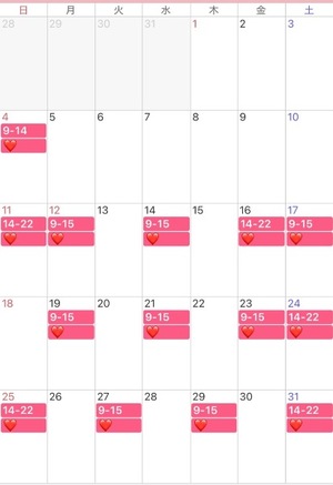 4日(日)9:00〜15:0011日(日)14:00〜22:0012日(月)9:00〜15:0014日(水)9:00〜15:0016日(金)14:00〜22:0017日(土)9:00〜15:0019日(月)9:00〜15:0021日(水)9:00〜15:0023日(金)9:00〜15:0024日(土)14:00〜22:0025日(日)14:00〜22:0027日(火)9:00〜15:0029日(木)9:00〜15:0031日(土)14:00〜22:00