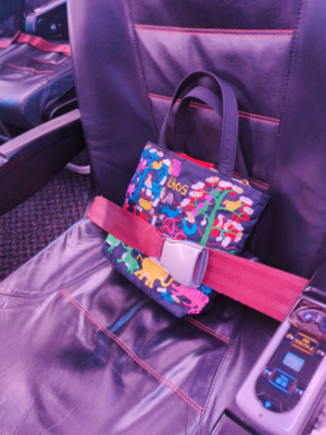 飛行機の中がガラガラだったので、ラオスで買った今いちばんお気に入りのカバンもシートベルトして遊んでたら…