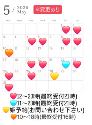 明日から出勤しまーす?14:00/18:30/20:30??です??ゴールデンウィークに向けて頑張るぞ?ご予約お待ちしております?姫予約はこちらから?【Gメール】