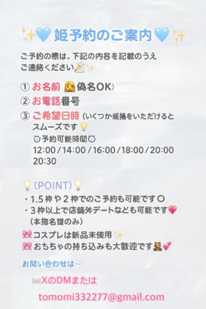 12時〜20.30受付になります姫予約お問い合わせはX @aika_06181230または、tomomi332277@gmail.comまでお問い合わせお願いします????埋めていただかないと返信できかねます?1月はお誕生日月なので会いにきてくれると嬉しいです?