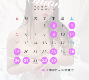 おはようございます(´?`*)しおんです!!4月のシフトをお知らせいたします♪全て10時から18時受付となっております(*´`)来月も皆様との出会いと再会とっても楽しみにしておりますね♪お待ちしております(*´`)しおん