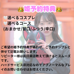 ※姫予約に無い衣装(ストッキング下着含む)の指定や着衣プレイ希望の方はお客様持ち込みでお願いいたします??♀?