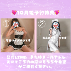 10月から姫予約特典を始めようかと思います?? 10/25〜31のコスプレイベント期間以外でもかえらの公式LINE、またはメールアドレスからご予約していただいた紳士様限定で