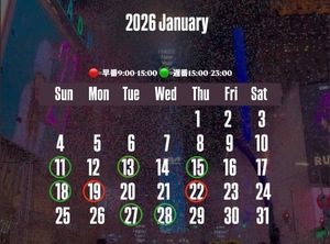 1/11 22:00-1/13 15:00-23:001/15 15:00-23:001/18 15:00-23:001/19 9:00-15:001/22 9:00-15:001/27 16:00-23:001/28 16:00-23:00