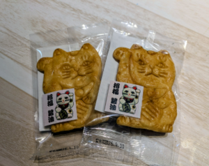 お土産の招き猫とお煎餅最高