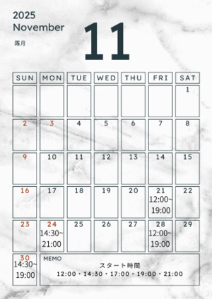 11月30日(日)14:30~16:30満/17:00~19:00満
