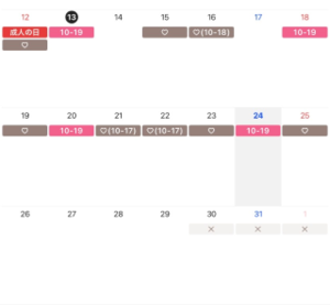 ピンクのところは出勤予定日、茶色の?はリクエスト可能日になります!