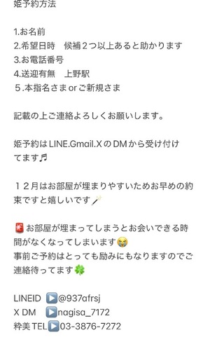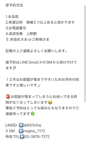 姫予約はLINE、Gmail、XのDMからよろしくお願い🙇
