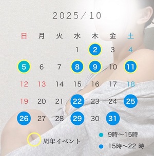 ・10/1・2 … 周年前夜祭(姫予約・本指名様・GA会員様 限定)・10/3〜9 … 周年祭(すべてのお客様 対象)・10/10・11 … 周年後夜祭(姫予約・本指名様・GA会員様 限定)
