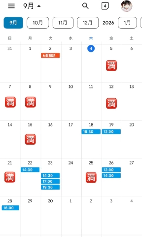 次回空き枠9月23日 14:30〜/17:00〜/