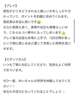 一度卒業して、また再会してくださったお客様から「ゆいちゃんが卒業して喪失感がすごかった」「夢にも出てきた。」「戻ってきてくれて嬉しい」「ゆいちゃんが卒業してから風俗卒業してた」と言っていただくことが多く